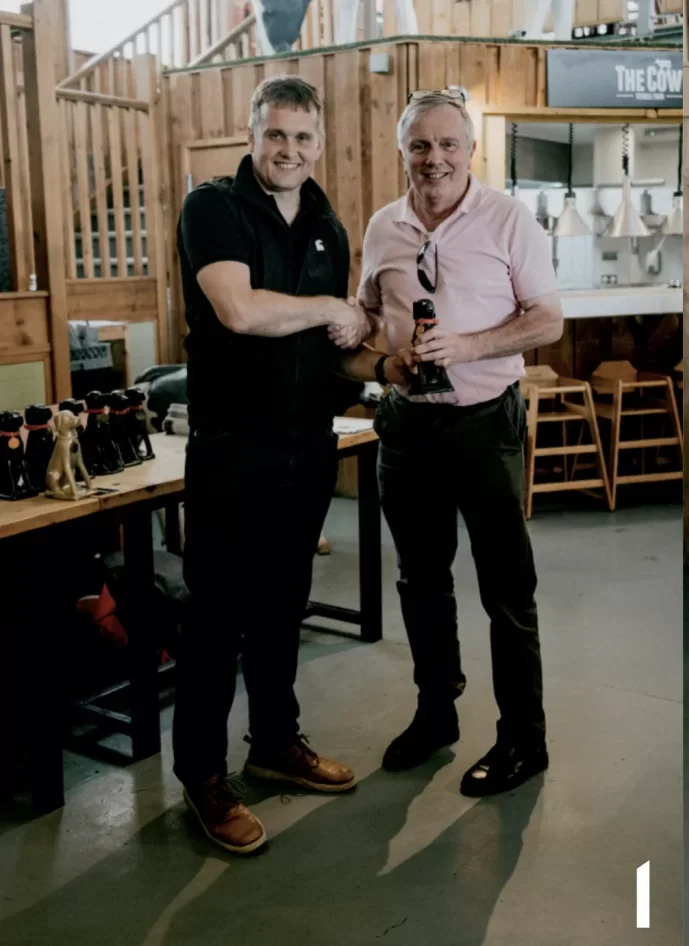 Henry Knight receiving the award from Hugh Wells of Charnwood.