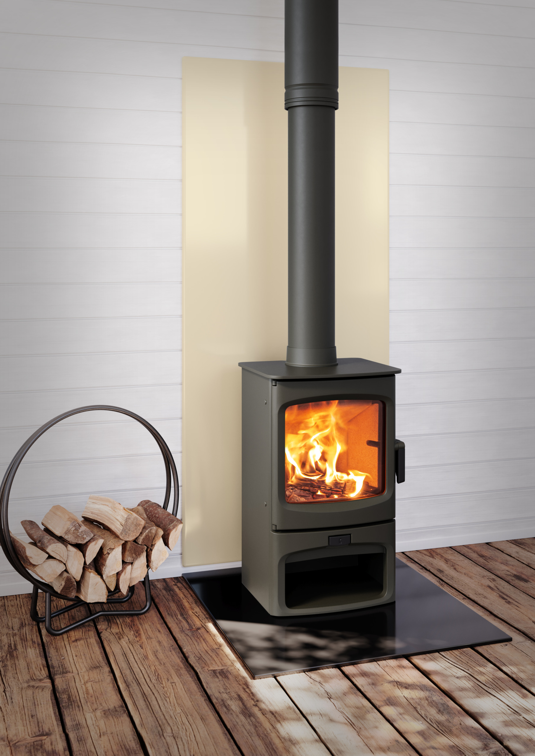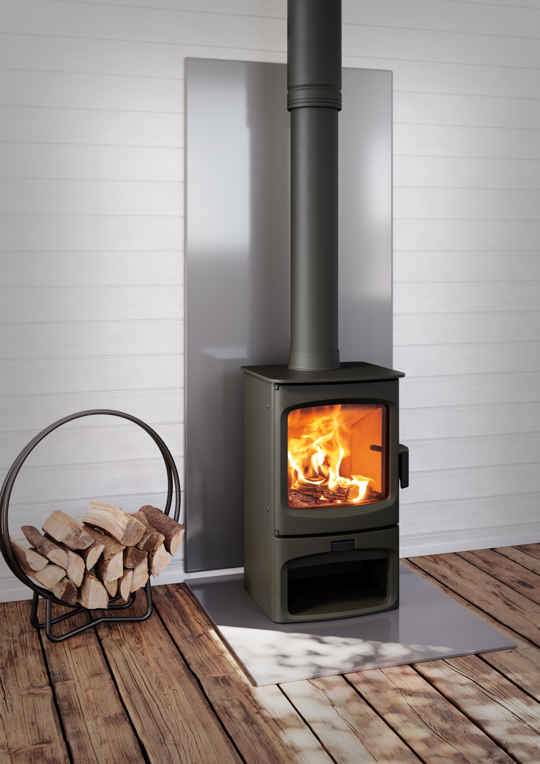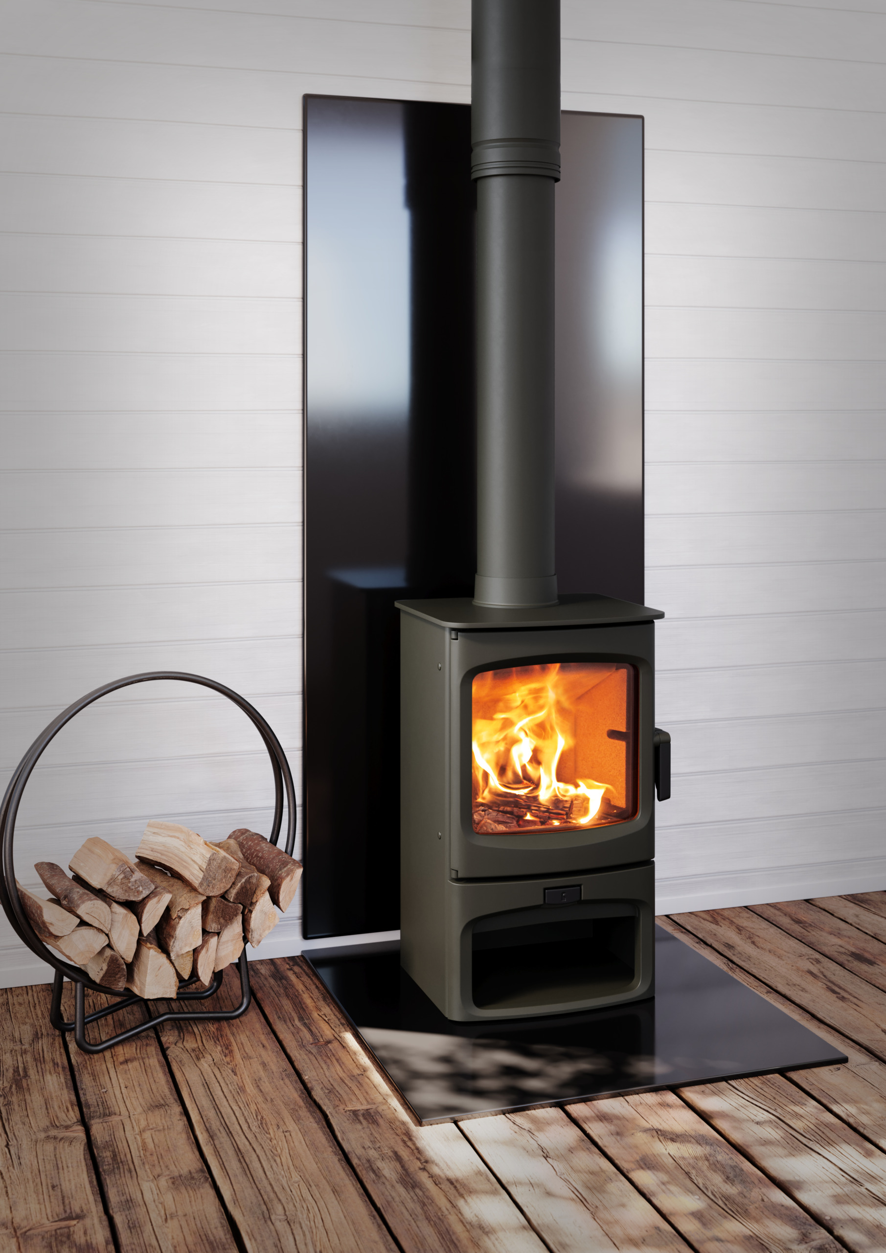 Charnwood Fireside Heat Shields are designed to protect and enhance the wall behind a wood-burning stove creating a modern fireplace.